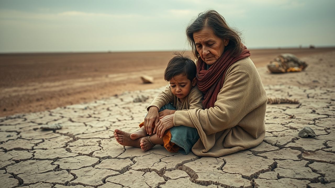{"prompt":"A heartfelt, panoramic documentary-style photograph capturing raw realism. The scene features a weathered mother in her early 30s to late 40s, sitting exhausted on cracked, arid earth in a barren, desolate landscape. Her expression is distant and burdened, reflecting deep worry and quiet despair. Nestled beside her, a young child aged 5 to 7, with a tired, somber face, gazes downward or looks away, embodying silent hardship and emotional fatigue. The expansive background reveals a wide, dusty plain extending toward a hazy horizon beneath an overcast, muted sky tinged with dusty hues. Sparse, withered vegetation and scattered stones break the flat terrain, highlighting the environment's severity. The scene is bathed in a gentle, diffuse late afternoon light, producing elongated shadows that emphasize textures of the cracked earth and the figures' worn, simple clothing in subdued tones of brown, ochre, gray, and faded blue. The composition is intentionally broad, positioning the mother and child slightly off-center to evoke their solitude amid the vast, relentless wilderness, with no textual or graphic elements disrupting the stark, honest portrayal.\n\nA poignant, wide (landscape) photograph in a realistic, photo-journalistic style. The scene depicts a young, weary mother, approximately 30-40 years old, sitting on parched, cracked earth in a desolate, arid landscape. Her gaze is distant and filled with deep concern and quiet desperation. Leaning against her side, a child (around 5-7 years old) sits with a somber, exhausted expression, looking down or slightly away, conveying a profound sense of emptiness and silent struggle. The background is a vast, dry plain stretching to a hazy horizon under a muted, dusty sky. Sparse, withered brush or rocks dot the barren ground, emphasizing the harshness of the environment. The light is a soft, diffused late afternoon glow, casting subtle, long shadows that accentuate the figures and the textures of the dry earth. Colors are predominantly earthy tones - muted browns, ochres, and desaturated grays and blues for the distant landscape and the figures' worn, simple clothing. The overall composition should be wide, placing the mother and child slightly off-center to emphasize their isolation within the vast, unforgiving environment, without any text, logos, or other typographic elements.","originalPrompt":"A poignant, wide (landscape) photograph in a realistic, photo-journalistic style. The scene depicts a young, weary mother, approximately 30-40 years old, sitting on parched, cracked earth in a desolate, arid landscape. Her gaze is distant and filled with deep concern and quiet desperation. Leaning against her side, a child (around 5-7 years old) sits with a somber, exhausted expression, looking down or slightly away, conveying a profound sense of emptiness and silent struggle. The background is a vast, dry plain stretching to a hazy horizon under a muted, dusty sky. Sparse, withered brush or rocks dot the barren ground, emphasizing the harshness of the environment. The light is a soft, diffused late afternoon glow, casting subtle, long shadows that accentuate the figures and the textures of the dry earth. Colors are predominantly earthy tones - muted browns, ochres, and desaturated grays and blues for the distant landscape and the figures' worn, simple clothing. The overall composition should be wide, placing the mother and child slightly off-center to emphasize their isolation within the vast, unforgiving environment, without any text, logos, or other typographic elements.","width":1280,"height":720,"seed":42,"model":"flux","enhance":false,"nologo":true,"negative_prompt":"undefined","nofeed":false,"safe":false,"quality":"medium","image":[],"transparent":false,"isMature":false,"isChild":false}