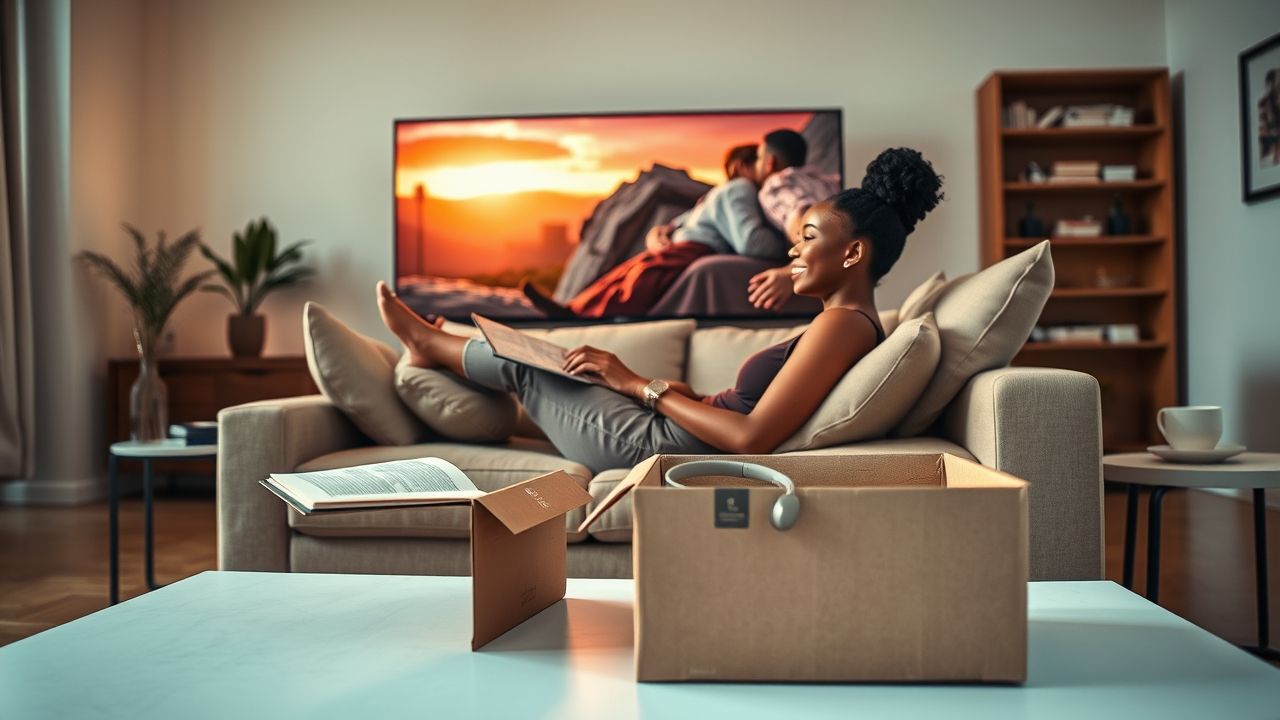 {"prompt":"A wide, inviting shot of a modern, well-lit living room, bathed in warm, soft ambient light, possibly from a large window or soft lamps, creating a cozy and content atmosphere. In the center, a diverse person (e.g., a woman in her early 30s) is comfortably lounging on a stylish, neutral-toned sofa, embodying relaxation and convenience. A large smart TV in the background displays a vibrant, high-quality fictional scene reminiscent of a premium streaming service, rich with cinematic detail and warm, appealing colors, clearly visible but not overwhelming the composition. On a small side table or on the sofa arm, a sleek tablet or e-reader is open, showing a page of an engaging digital book. Nearby, a pair of subtle, high-quality headphones rests on an armrest or a cushion, suggesting audio content. On a minimalist coffee table in the foreground, a recently opened, generic brown cardboard delivery box is present, with a corner slightly open to reveal a glimpse of a desirable item inside (e.g., a new tech gadget or an art book), subtly symbolizing fast and convenient shipping. The scene is meticulously clean, unbranded, and focuses on the seamless integration of various digital and physical benefits into daily life, without any distracting elements. No text, logos, or watermarks are visible. Realistic, high-quality photography style with excellent depth of field.","originalPrompt":"A wide, inviting shot of a modern, well-lit living room, bathed in warm, soft ambient light, possibly from a large window or soft lamps, creating a cozy and content atmosphere. In the center, a diverse person (e.g., a woman in her early 30s) is comfortably lounging on a stylish, neutral-toned sofa, embodying relaxation and convenience. A large smart TV in the background displays a vibrant, high-quality fictional scene reminiscent of a premium streaming service, rich with cinematic detail and warm, appealing colors, clearly visible but not overwhelming the composition. On a small side table or on the sofa arm, a sleek tablet or e-reader is open, showing a page of an engaging digital book. Nearby, a pair of subtle, high-quality headphones rests on an armrest or a cushion, suggesting audio content. On a minimalist coffee table in the foreground, a recently opened, generic brown cardboard delivery box is present, with a corner slightly open to reveal a glimpse of a desirable item inside (e.g., a new tech gadget or an art book), subtly symbolizing fast and convenient shipping. The scene is meticulously clean, unbranded, and focuses on the seamless integration of various digital and physical benefits into daily life, without any distracting elements. No text, logos, or watermarks are visible. Realistic, high-quality photography style with excellent depth of field.","width":1280,"height":720,"seed":42,"model":"flux","enhance":false,"nologo":true,"negative_prompt":"undefined","nofeed":false,"safe":false,"quality":"medium","image":[],"transparent":false,"isMature":false,"isChild":false}