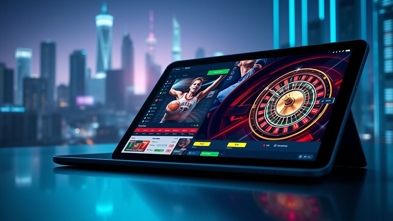 {"prompt":"A wide (landscape) shot capturing the essence of a leading online gambling platform. In the foreground, a sleek, modern tablet or laptop screen is prominently displayed, showcasing a dynamic, split-view interface. One side of the screen vividly presents a sophisticated sports betting interface with graphical representations of diverse sports (e.g., subtle action lines for a soccer match or basketball game), featuring evolving odds and game scores. The other side displays a high-resolution, vibrant online casino game, such as a spinning roulette wheel with a gleam of light on the numbers, or a detailed, engaging slot machine game in action. The screen itself is bright and highly detailed, without any discernible text or logos, but clearly representing an interactive betting environment. The device rests on a polished, reflective dark surface. In the subtly blurred background, a futuristic, high-tech cityscape is visible, adorned with glowing digital lines and architectural details, conveying a sense of global reach, technological innovation, and connectivity. The lighting is sophisticated and ambient, with cool blue and purple tones dominating the background, while the screen emits a warm, inviting glow that subtly illuminates the foreground. Occasional golden or amber light streaks subtly accentuate the digital background, hinting at luxury and premium service. The overall composition is clean, modern, and visually appealing, emphasizing the seamless integration of sports and casino entertainment in a secure, digital landscape.","originalPrompt":"A wide (landscape) shot capturing the essence of a leading online gambling platform. In the foreground, a sleek, modern tablet or laptop screen is prominently displayed, showcasing a dynamic, split-view interface. One side of the screen vividly presents a sophisticated sports betting interface with graphical representations of diverse sports (e.g., subtle action lines for a soccer match or basketball game), featuring evolving odds and game scores. The other side displays a high-resolution, vibrant online casino game, such as a spinning roulette wheel with a gleam of light on the numbers, or a detailed, engaging slot machine game in action. The screen itself is bright and highly detailed, without any discernible text or logos, but clearly representing an interactive betting environment. The device rests on a polished, reflective dark surface. In the subtly blurred background, a futuristic, high-tech cityscape is visible, adorned with glowing digital lines and architectural details, conveying a sense of global reach, technological innovation, and connectivity. The lighting is sophisticated and ambient, with cool blue and purple tones dominating the background, while the screen emits a warm, inviting glow that subtly illuminates the foreground. Occasional golden or amber light streaks subtly accentuate the digital background, hinting at luxury and premium service. The overall composition is clean, modern, and visually appealing, emphasizing the seamless integration of sports and casino entertainment in a secure, digital landscape.","width":1280,"height":720,"seed":42,"model":"flux","enhance":false,"nologo":true,"negative_prompt":"undefined","nofeed":false,"safe":false,"quality":"medium","image":[],"transparent":false,"isMature":false,"isChild":false}